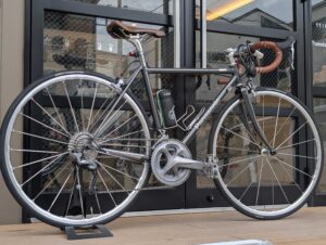 ポリッシュ仕上げの輝きがクロモリフレームと見事に調和し、往年のロードバイクファンにはたまらない一体感を生み出します。